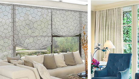 Dos visillos de diseño clásico vegetal y geométrico con una composición poliéster/ algodón y un ancho de 310 cm.